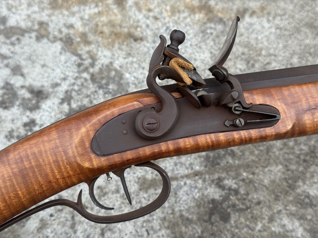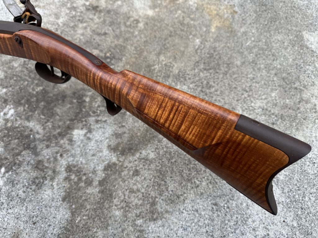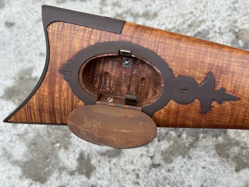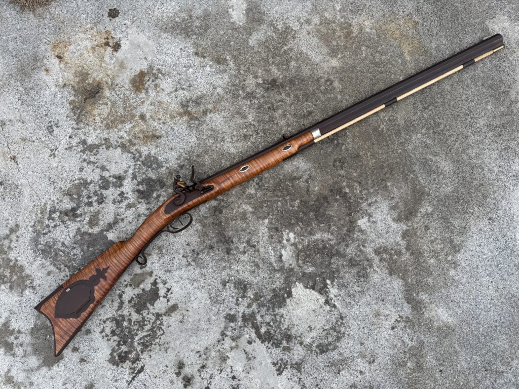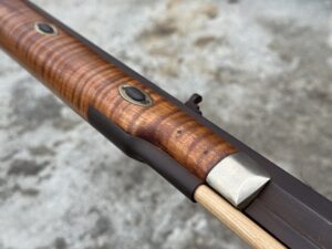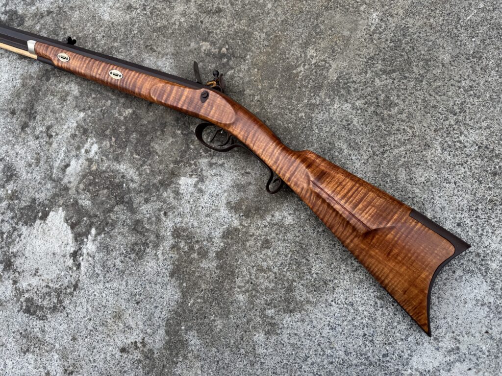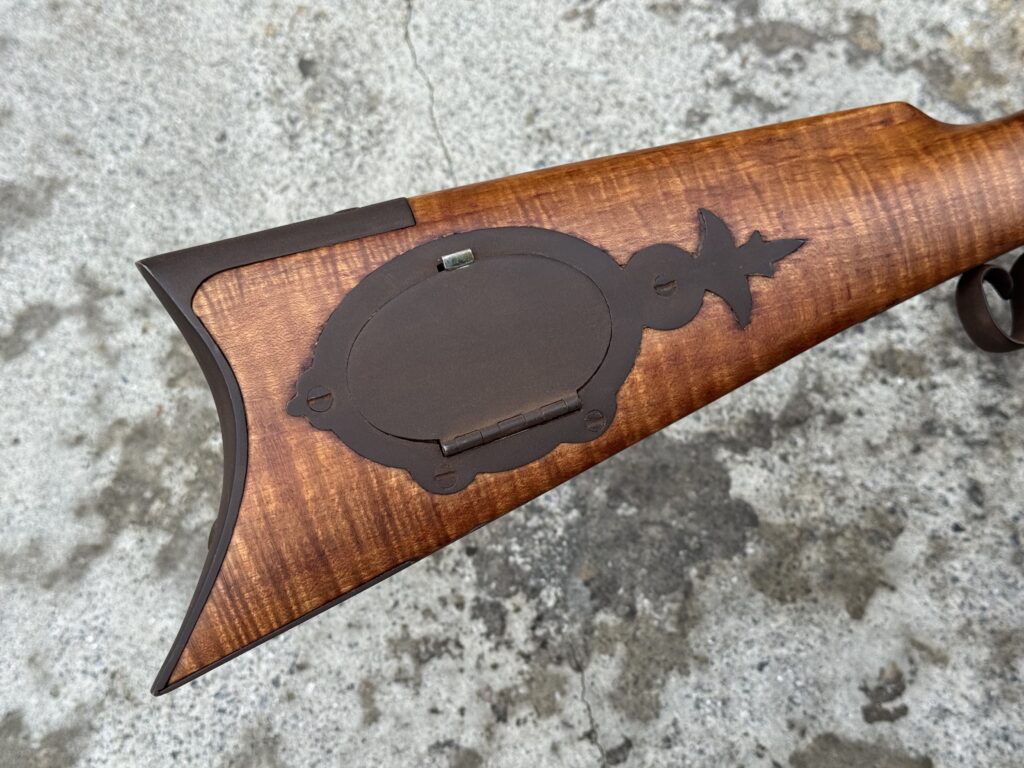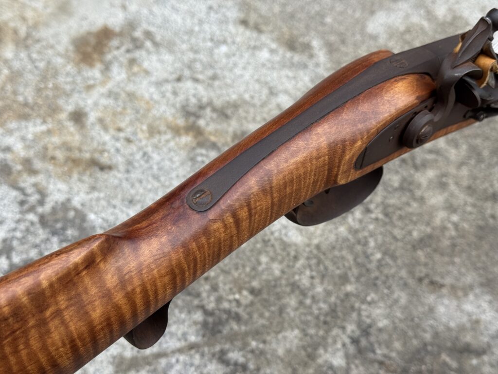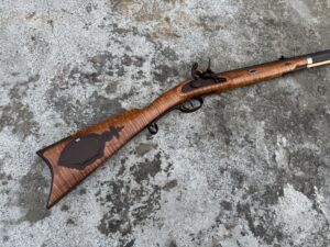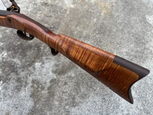This rifle is a 54 caliber “Jim Bridger” Style Hawken Rifle with fancy curly maple stock. It features a 1″ straight octagon Green Mountain Barrel 36″ in length, L&R flintlock, and Double Set Triggers.  It features iron mounts with the addition of a pineapple cap box and toe plate.