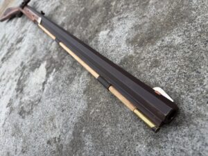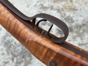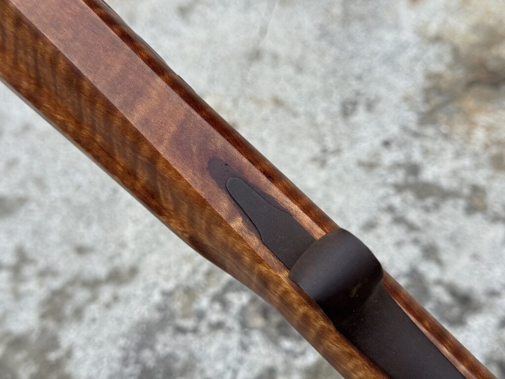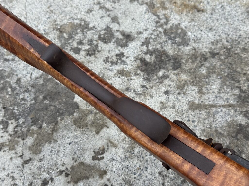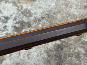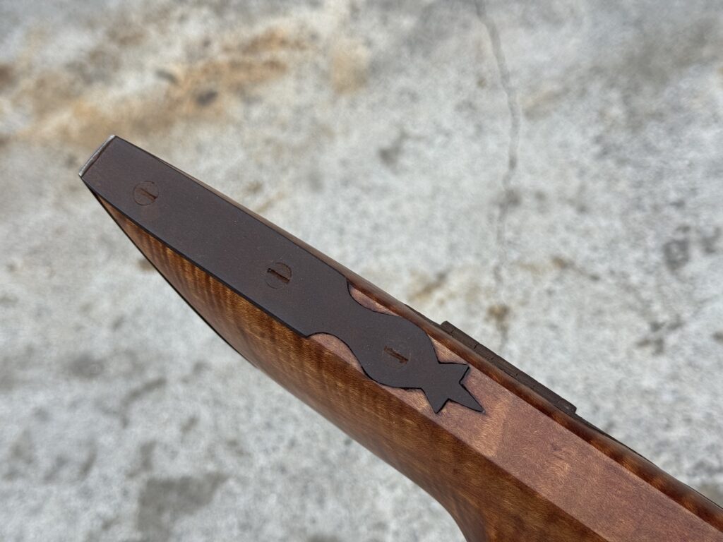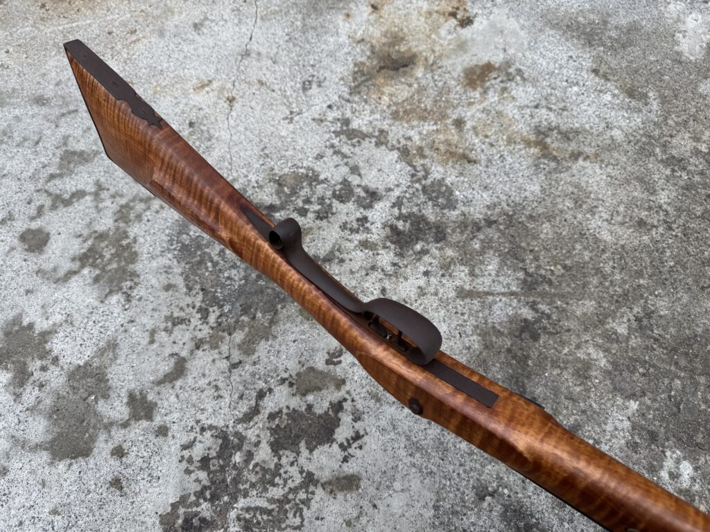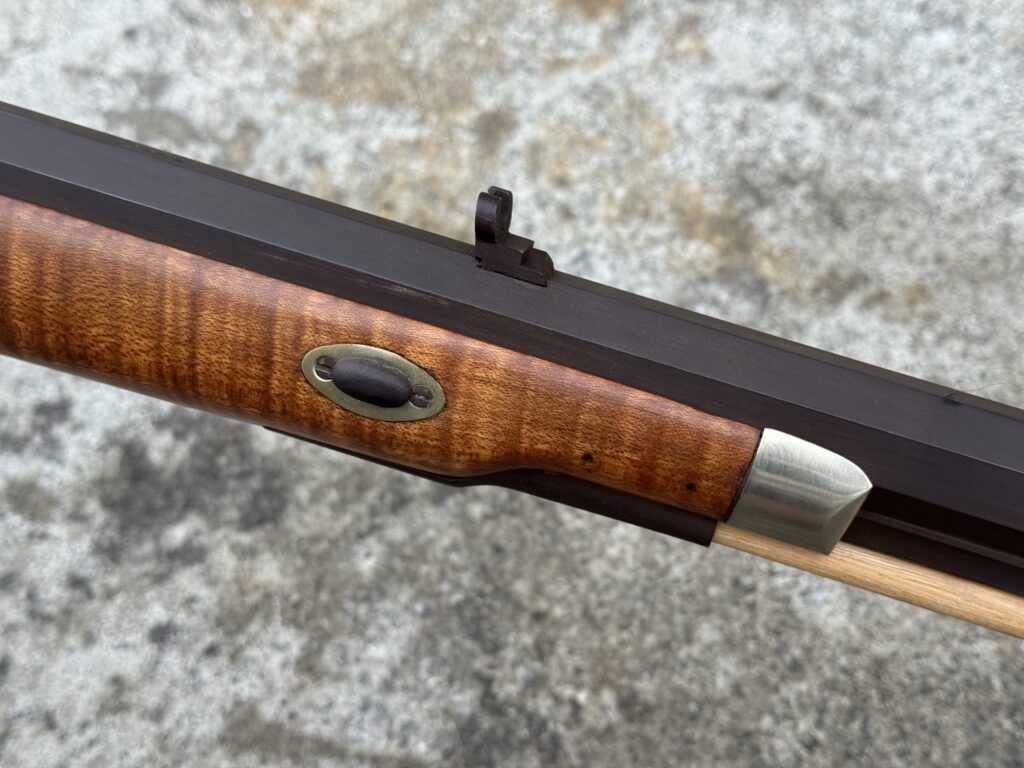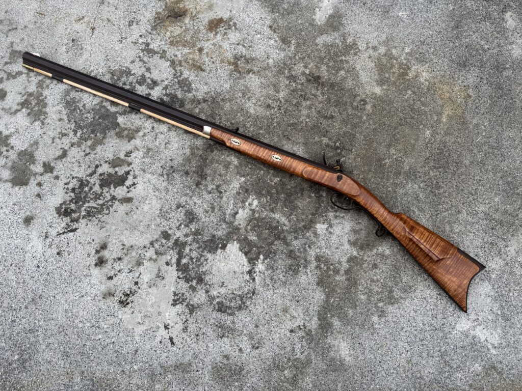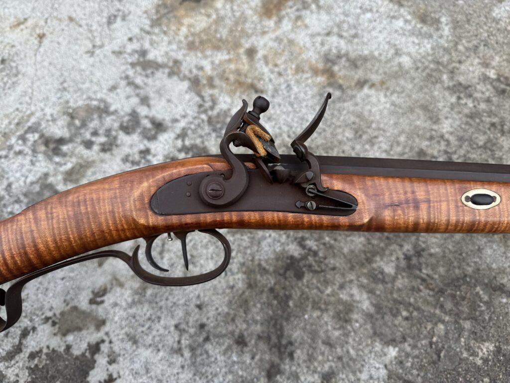 This rifle is a 54 caliber “Jim Bridger” Style Hawken Rifle with fancy curly maple stock. It features a 1″ straight octagon Green Mountain Barrel 36″ in length, L&R flintlock, and Double Set Triggers.  It features iron mounts with the addition of a pineapple cap box and toe plate.