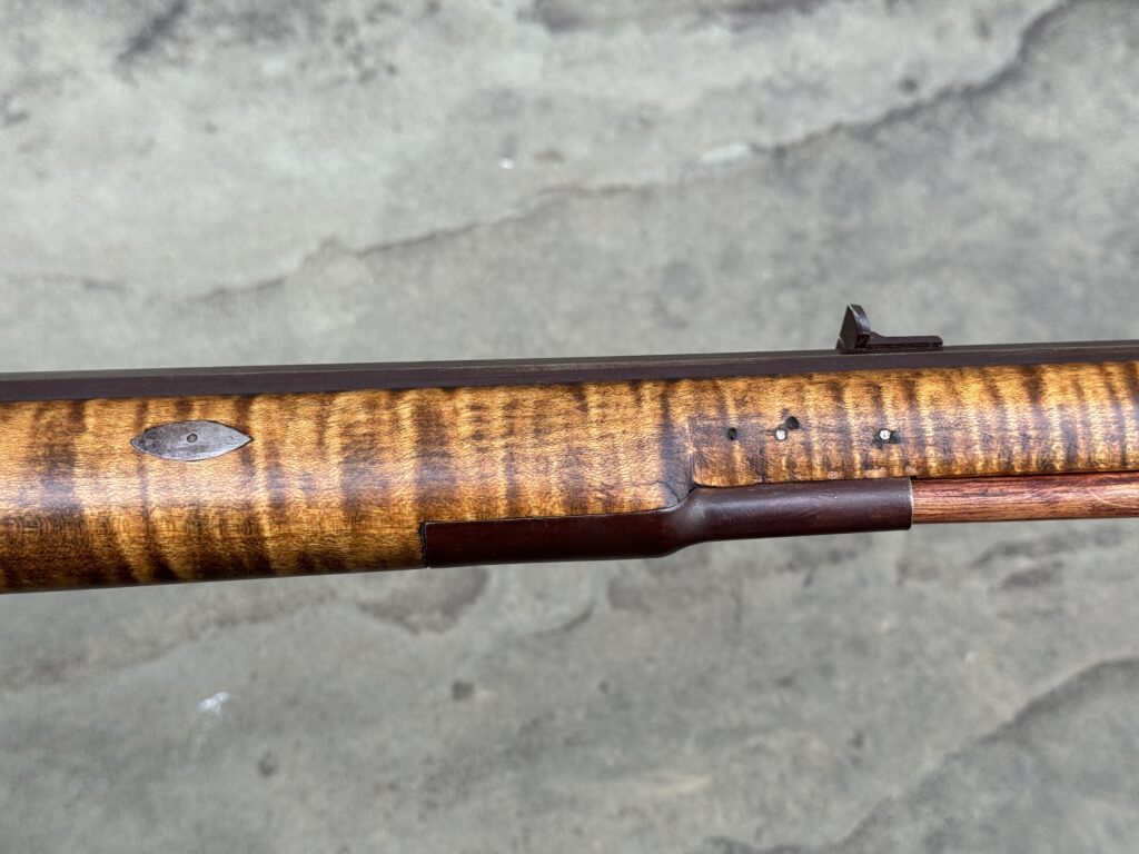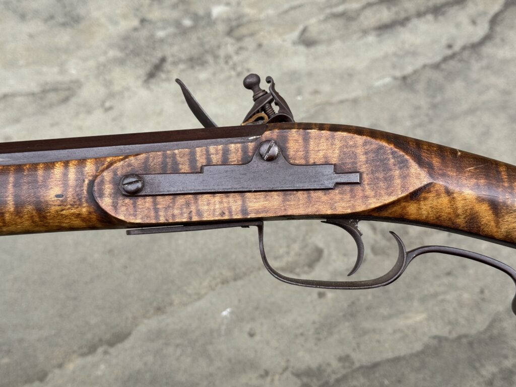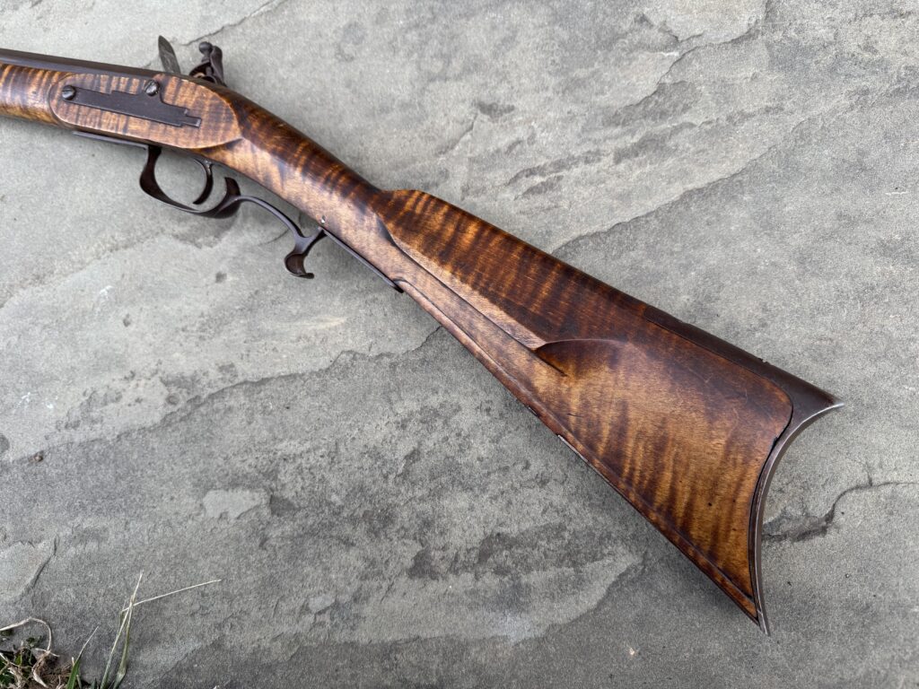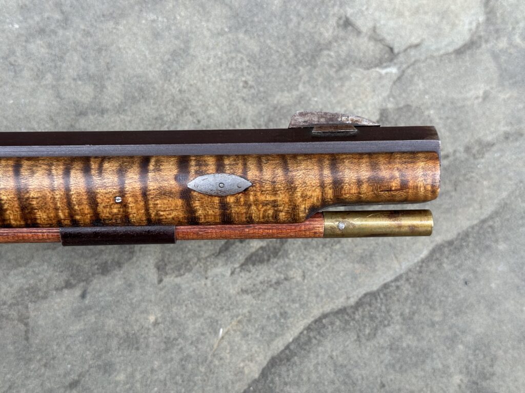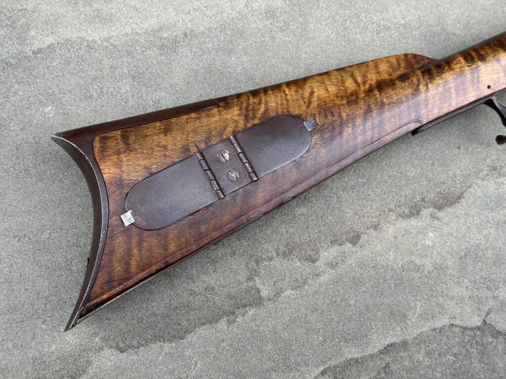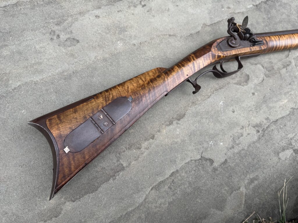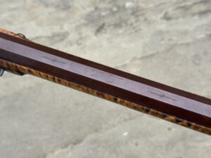 Here we have an old Southern Mountain Rifle build in 50 caliber smooth. It’s stocked in a nice piece of curly maple with good color on the stock, aged iron mounts, and 8 silver escutcheons out the forestock. It has a 42″ Colerain “C” weight swamped barrel in .50 caliber smooth, and is signed “T.J.” on the top flat. The lock is an L&R Flintlock and is signed “Tom Faux, Brighton Co” on the inside of the lock plate.