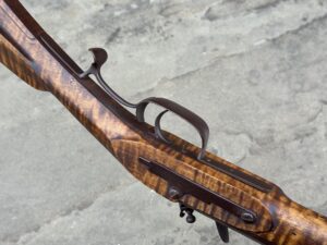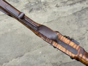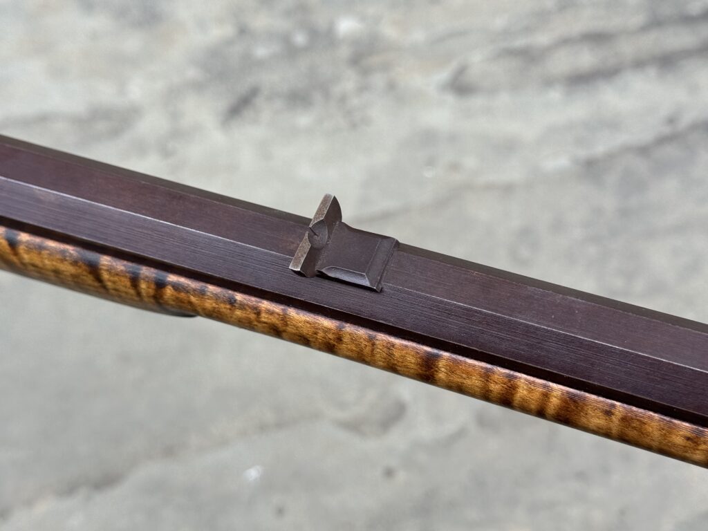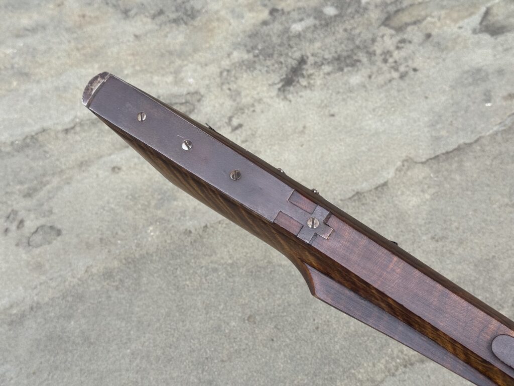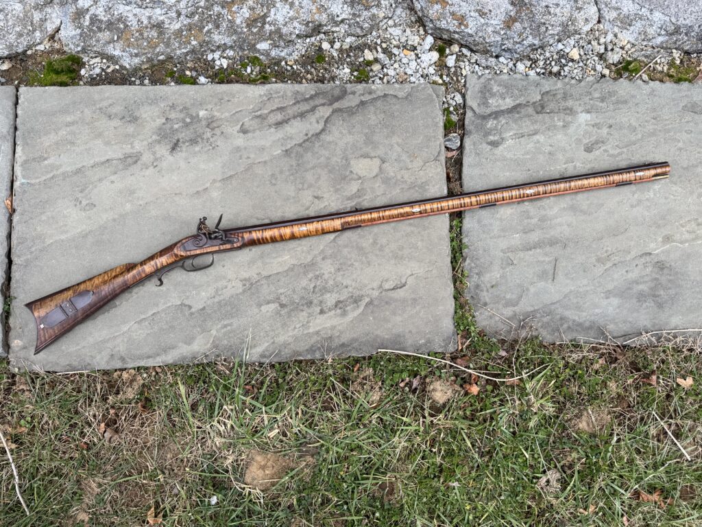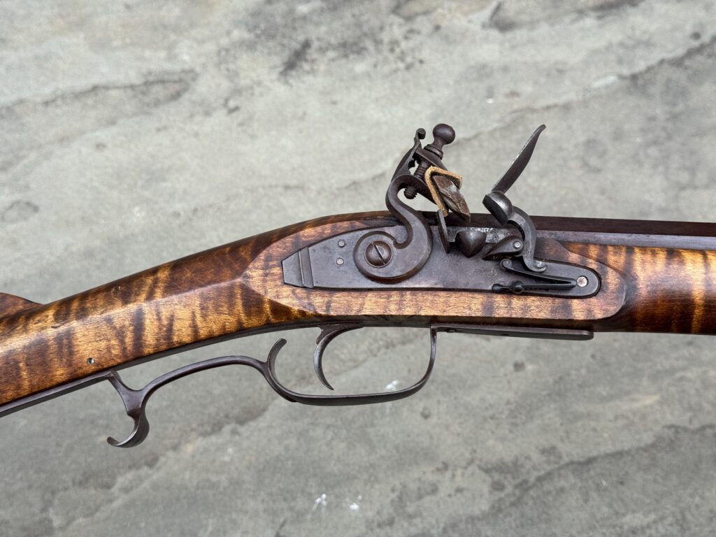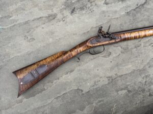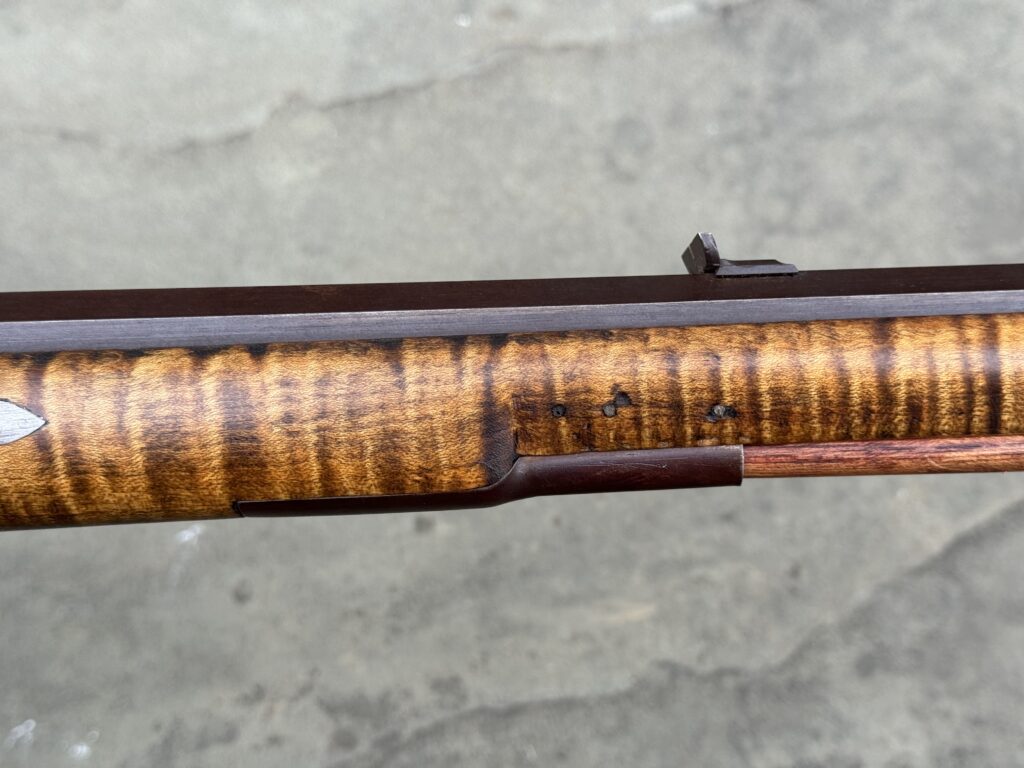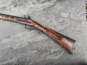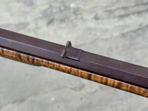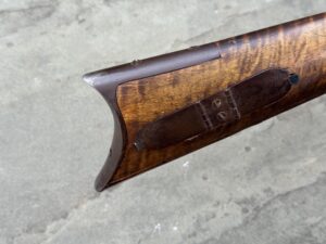 Here we have an old Southern Mountain Rifle build in 50 caliber smooth. It’s stocked in a nice piece of curly maple with good color on the stock, aged iron mounts, and 8 silver escutcheons out the forestock. It has a 42″ Colerain “C” weight swamped barrel in .50 caliber smooth, and is signed “T.J.” on the top flat. The lock is an L&R Flintlock and is signed “Tom Faux, Brighton Co” on the inside of the lock plate.